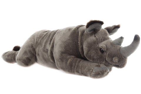 Plyšový nosorožec ležící o velikost cca 50 x 15 x 13 cm.