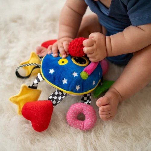 plyšový kamarád s kontrastní grafikou rozvíjející smysly děťátka, jemnou motoriku a kognitivní schopnosti