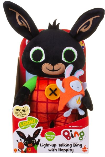Česky mluvící BING populární pohádky králíček Bing ti řekne více než 15 zábavných frází! Rozkošná plyšová hračka umí dokonce i svítit a má u sebe svého věrného kamaráda Hoppity. Bing miluje dobrodružství, ať už je to výlet do parku nebo den ve školce, bude ti perfektním společníkem. Stiskněte Bingovu pravou ručičku a pozorujte, jak vypráví a chichotá se. Bing je vyroben z měkkých texturovaných tkanin a má krásně vyšívané detaily. Součástí balení jsou 3AA baterie, které se dají vyměnit.