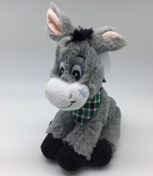 Plyšový oslík sedící s šátkem – velikost 25 cm. Vyrobeno z kvalitní plyše.