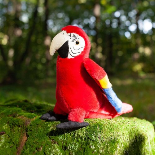 Plyšový pták papoušek červený ara měří 24 cm a díky těm nejkvalitnějším materiálům se řadí do Exkluzivní kolekce plyšových hraček značky Rappa.