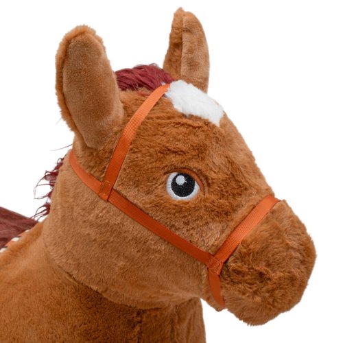 Skákadlo je potaženo měkkým, protiskluzovým plyšem, velmi příjemným na dotek. Je vybaveno zvukovým modulem – po stisknutí mezi oušky vydává realistický zvuk koníka, což podporuje představivost a motivuje k aktivní hře.