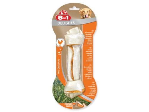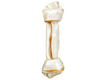 Žvýkací kost s se sušeným kuřecím masem uvnitř, doplňkové krmivo pro dospělé psy od 20 do 40 kg hmotnosti.