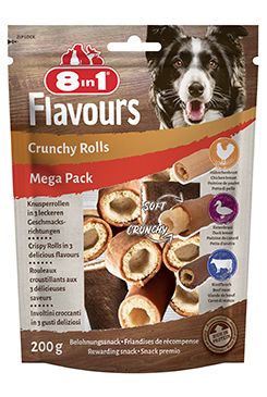 Doplňkové krmivo pro dospělé psy, pochoutky 8in1 Flavours Crunchy Rolls mají vysoký obsah kuřecích a kachních prsou a také hovězího masa.