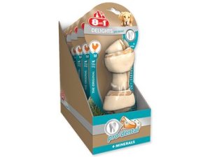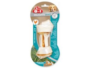 Žvýkací kost s mineráliemi a se sušeným kuřecím masem uvnitř, doplňkové krmivo pro dospělé psy od 12 do 35 kg hmotnosti.