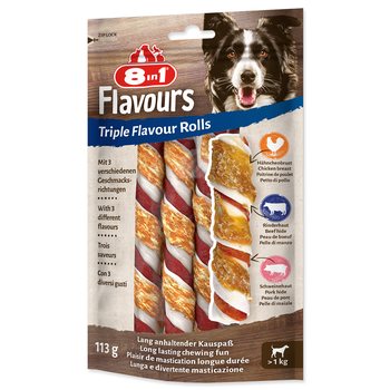 Lahodné žvýkací rolky s vepřovou kůží a hovězí kůží zabalené s kuřecími filé. Doplňkové krmivo pro psy.