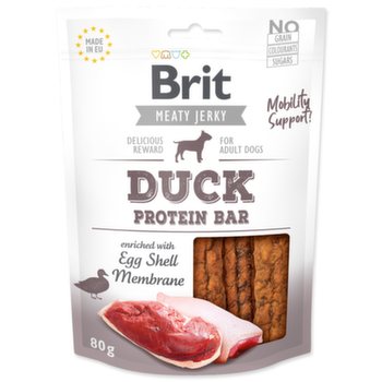 Sušené masové pamlsky pro dospělé psy všech plemen Brit Jerky Protein Bar ve formě proteinové tyčinky. S obsahem 85 % kachního a kuřecího masa.