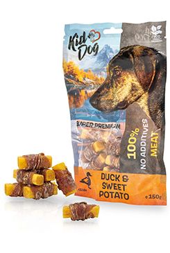 Kiddog Superpremium Snack je monoproteinový šetrně sušený produkt, batátová tyčinka se 100% kachním masíčkem. Vynikající pamlsek bez obilovin a aditiv. Disponuje vysokým obsahem bílkovin, stopových prvků i vitamínů a výbornou stravitelností díky batátům. Batáty, bohaté na antioxidanty chrání buňky před poškozením volnými radikály a dodávají energii díky obsahu komplexních sacharidů.