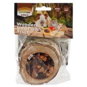 Miska ze dřeva listnatých stromů je naplněna ovocnou směsí. Váš mazlíček se při vykusování náplně zabaví a zároveň okus dřeva pomáhá přirozené péči o zuby. Prázdnou misku můžete poté znovu naplnit oblíbeným krmivem vašeho zvířete.