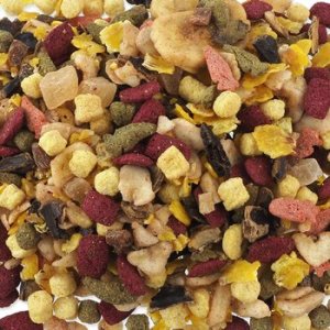 Složení: Extrudovaná kukuřičná mouka, sušené banány 22 %, kukuřičné vločky, karob, sušený ananas 7,2 %, sušené meruňky 4,8 %, sušená červená řepa 2,2 %, sušená vojtěška, rýžové pukance, sušená mrkev.