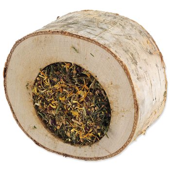 Miska ze dřeva listnatých stromů je naplněna chutnou směsí s petrželí, okvětními lístky růže a měsíčkem lékařským. Váš mazlíček se při vykusování náplně zabaví a zároveň okus dřeva pomáhá přirozené péči o zuby. Prázdnou misku můžete poté znovu naplnit oblíbeným krmivem vašeho zvířete.