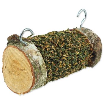 Doplňkové krmivo pro králíky a hlodavce. Válec ze dřeva listnatých stromů je naplněn chutnou směsí s petrželí, okvětními lístky růže a měsíčkem lékařským. Váš mazlíček se při vykusování náplně zabaví a zároveň okus dřeva pomáhá přirozené péči o zuby.