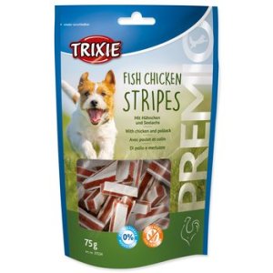 Pamlsek pro psy, pásky s kuřecím masem a treskou.