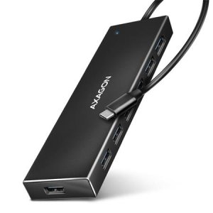 Tenký USB-C 3.2 Gen 1 (USB 3.0) hub AXAGON HUE-F7C s USB kabelem dlouhým 1.2m snadno a rychle připojí k notebooku až sedm USB zařízení současně.