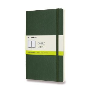 Zelený zápisník s měkkou, ve hřbetu šitou vazbou.