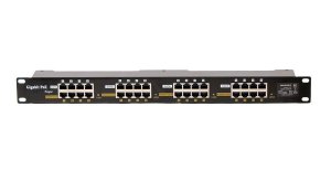 Panel do 19" racku integrující 16 gigabitových stíněných pasivních POE injektorů s napájecím rozsahem 24 - 57V.