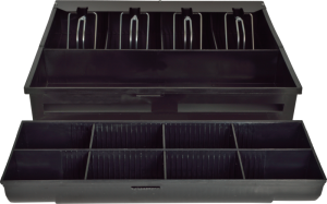 Velká černá pokladní zásuvka POS-420 (bez zdroje) s automatickým vysouváním pro pohodlnou a rychlou manipulaci s bankovkami a mincemi má robusní, tvrdou kovovou konstrukci.