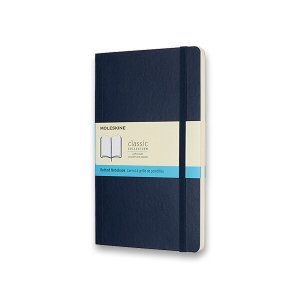 Zápisník s měkkou, ve hřbetu šitou vazbou v kartonových deskách, obepnutý pružnou páskou proti samovolnému otevírání.