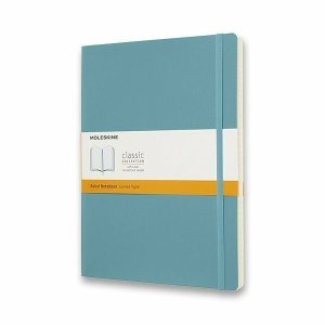 Zápisník s měkkou, ve hřbetu šitou vazbou v kartonových deskách, obepnutý pružnou páskou proti samovolnému otevírání.