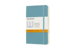 Zápisník s měkkou, ve hřbetu šitou vazbou v kartonových deskách, obepnutý pružnou páskou proti samovolnému otevírání.