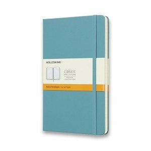 Zápisník s pevnou, ve hřbetu šitou vazbou v kartonových deskách, obepnutý pružnou páskou proti samovolnému otevírání.
