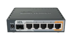 MikroTik hEX PoE lite; Routerboard RB750UPr2 má 4 PoE porty (porty 2–5) a může tak napájet další AP nebo routery.