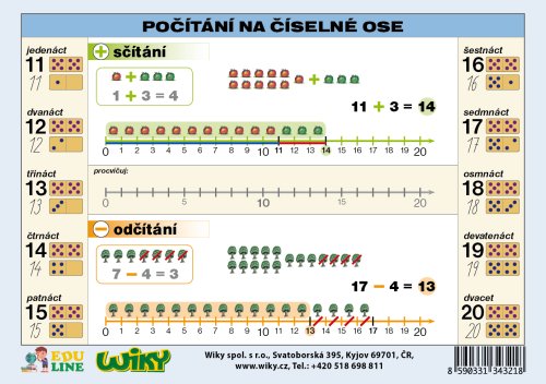 Naučná tabulka POČÍTÁNÍ NA ČÍSELNÉ OSE je dalším příspěvkem k modernizaci výuky matematiky na základních školách. Jednoduchá a přehledná tabulka napomáhá k snadnějšímu osvojení sčítání a odčítání. A5 lamino