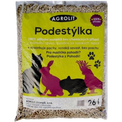 Podestýlka z lisovaných dřevitých pelet vyniká minimální prašností a dobrou absorpční schopností bez chemických příměsí a pojidel. Pelety jsou lisovány z kvalitních odkorněných pilin měkkého dřeva. Vhodná pro: drobné savce, exotické ptactvo, terarijní zvířata, kočky a štěňata.