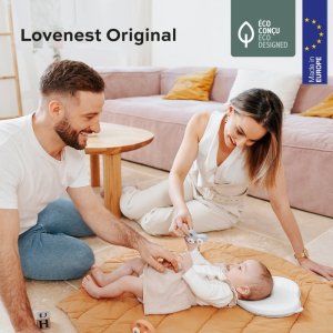 Podhlavníček LoveNest byl patentován a je vyráběn v Portugalsku. Je speciálně tvarovaný tak, aby vyhovoval tvaru lebky kojence a zajišťoval rovnoměrné rozložení tlaku po hlavičce a zároveň umožňoval úplnou volnost pohybu.