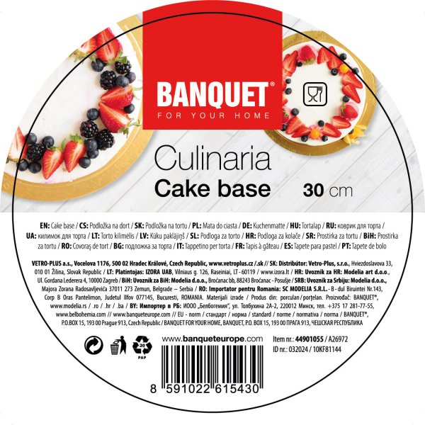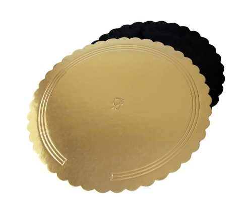 Kulatá podložka na dort CULINARIA. Podložka je vyrobena ze několikavrstvého 3 mm silného kartonu. Z obou stran je potažena zlatou fólií, která zaručuje voděodolnost a nepromastitelnost. Podložka pod dorty je ideální pracovní tácek, využijete ji při práci s dortem, finálním dozdobení a také k přenášení dortu.