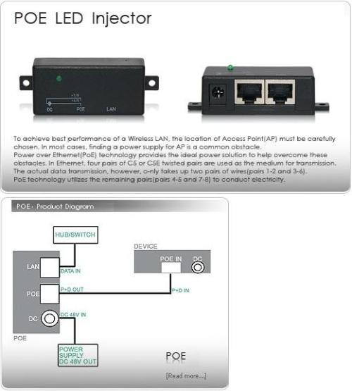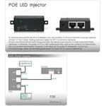 POE adaptér osazen LED kontrolkou pro vizuální kontrolu provozu.