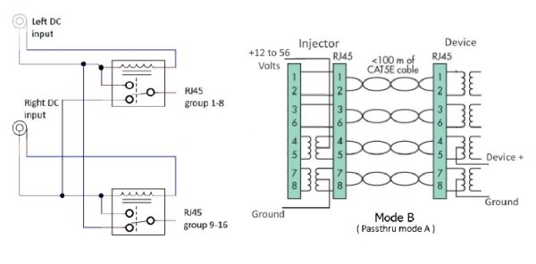 Vstup pro napájení prostřednictvím dvou 2.1mm 60V jacků. V případě připojení napájecího adaptéru pouze do jednoho z napájecích vstupů, je napájeno všech 24 portů. V případě připojení napájecích adaptérů do obou napájecích vstupů, jsou z prvního vstupu napájeny porty 1-12, z druhého vstupu porty 13-24.