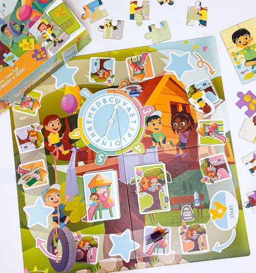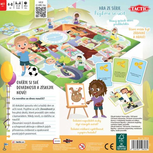 Ověřte si své dovednosti a získejte nové!Dokážeš napodobit zvuky čtyř různých zvířat?Dokážeš nůžkami vystřihnout z papíru hvězdu?Již dokážeš spoustu věcí a každý den se učíš nové. Pojďme se učit: Dovednosti je hra plná úkolů, které provádíš sám nebo s kamarádem, Nikdy nevíš, co dalšího se naučíš!Zkoumání nových dovedností a schopností aktivuje v dětech jejich přirozenou zvídavost a opakovaně poutá jejich pozornost.Deskové hry vytvářejí pro dítě bezpečné prostředí pro učení různých dovedností. Hraní her umožňuje dětem zlepšovat sociální dovednosti, naučit se spolupracovat a bavit se. Také učí děti trpělivosti při čekání na svůj tah a vyhrávat i prohrávat. Ale hlavně jim umožňuje pokaždé hrát znovu a každou hrou se zlepšovat.Obsah balení: herní plán100 karet4 skládačky (každá se 6 dílky),4 kartonové figurky + plastové stojánkyroztáčecí šipkapravidla