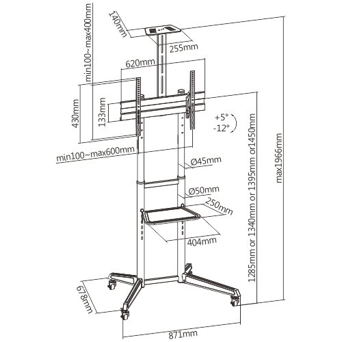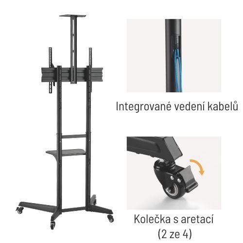 Hlavní vlastnosti: • Montáží deska pro upevnění TV je nastavitelná ve čtyřech výškových úrovních – 1285, 1340, 1395 nebo 1450 mm • Výškově nastavitelná police s nosností až 5 kg poskytuje dostatek úložného prostoru pro příslušenství • Výškově nastavitelná police s nosností až 5 kg na kameru • Jednoduchá změna náklonu TV v rozsahu +5°~-12° bez použití nástrojů • 4 kolečka umožňují snadné a bezpečné přemístění stojanu dle potřeby, 2 kolečka s možností aretace • Vnitřní vedení kabelů rámem stojanu pro jejich snadnou organizaci a uspořádání • Podporované rozteče VESA: 100x100,200x100,200x200,300x200,400x200,300x300,400x300,400x400,600x400 • Jednoduchá a rychlá montáž