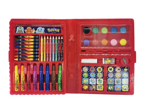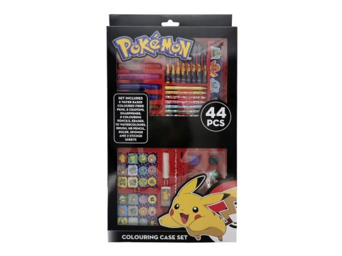 Pokémon set na kreslení s motivem Pokémonů. Balení obsahuje 8ks barevných fix, 8ks voskovek, barevné pastelky, ořezávátko, gumu, pravítko, set vodovek se štětcem, tužku HB a dva sety samolepek.