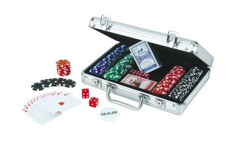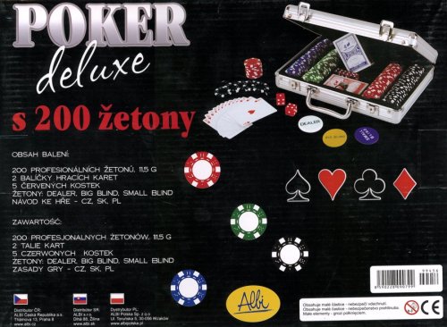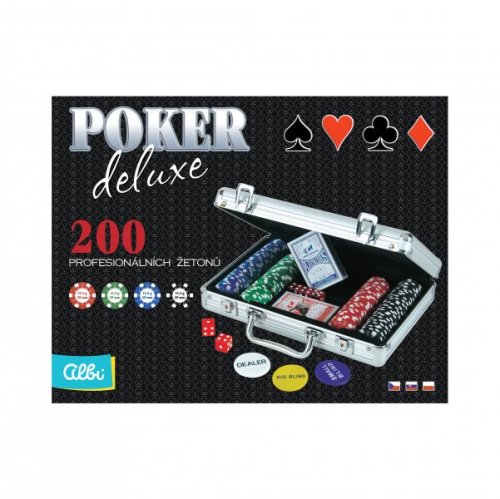 Klasický pokerový hliníkový kufřík ve stříbrné barvě, který obsahuje 200 kvalitních 11,5 gramových žetonů, 2 balíčky karet a 5 hracích kostek. Kufřík je vhodný pro pokerovou variantu Texas Hold'em.