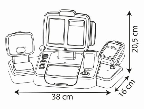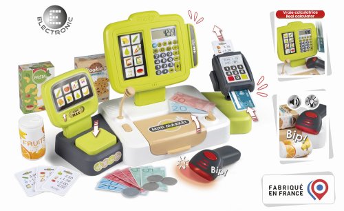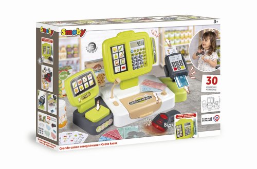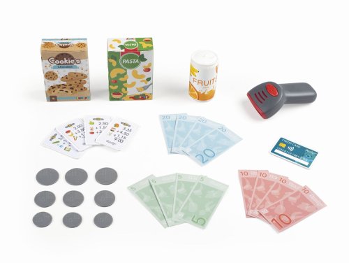 Elektronická pokladna s funkcí skutečné kalkulačky, skener se světelnou a zvukovou funkcí, čtečka kreditních karet s účtenkou, mechanická váha, makety potravin, mikrofon a další. Rozměry: 39 x 21,5 x 16 cm.