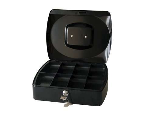 Rozměry 25 x 18 x 9 cm. Ocelová schránka na peníze s plastovým pořadačem na bankovky a kovové mince a úložným prostorem pod pořadačem. Kvalitní práškový lak a zámek. EAN 8590419523488