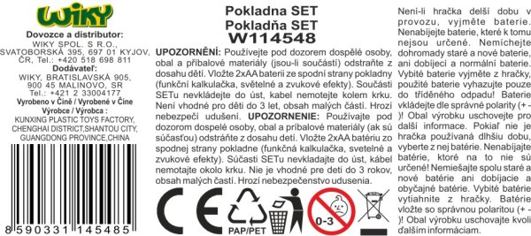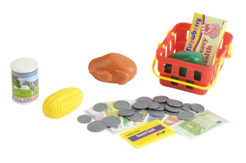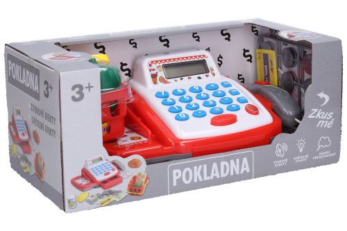 Pokladna set. Balení obsahuje pokladnu, košík s potravinami, kreditku, bankovky, mince. Velikost pokladny 25 cm. Vytváří světelné a zvukové efekty. 2xAA nejsou součástí, krytka zespodu pokladny.