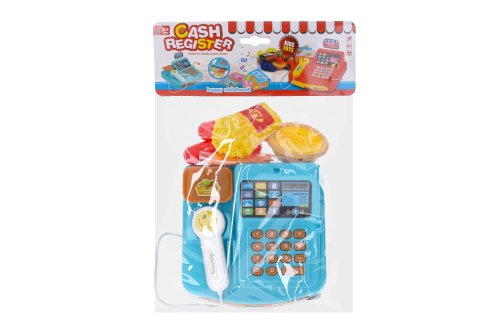 Pokladna s doplňky. Rozměry 15x15x6,5 cm. Světelné a zvukové efekty. 2xAA baterie. Obsah balení - pokladna, potraviny, peníze.