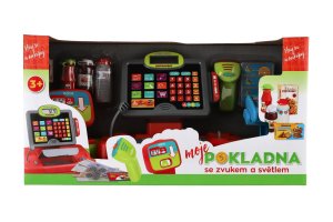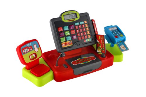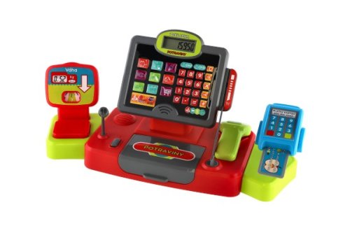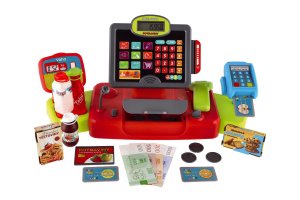 Dětská elektronická pokladna s doplňky pro každý správný obchod s potravinami! Součástí je čtečka se světlem a zvukem, makety bankovek a mincí, slot pro kreditní kartu, funkční kalkulačka, makety potravin i váha na ovoce a zeleninu. U nás v potravinách si vyberete! Na baterie 2x AA, nejsou součástí balení. Rozměr balení: 48 x 25 x 19 cm Vhodné pro děti od 3 let