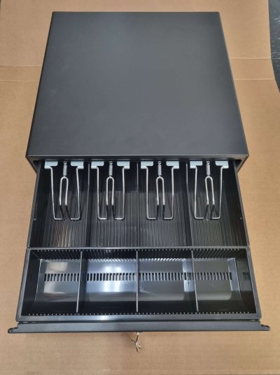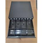 Pokladní zásuvka FEC POS-330 má flexibilní zásobníky na mince, čtyři kovové klipsy na bankovky a dvě přední externí přihrádky pro šeky / kupóny či kreditní karty. Uvolnění zásuvky má na starost mechanismus na zámek s klíčem. Toto velmi kvalitní zařízení s kompaktními rozměry, má životnost přes milion operací. Kovová zásuvka v elegantní černé barvě vás překvapí nízkou hmotností.