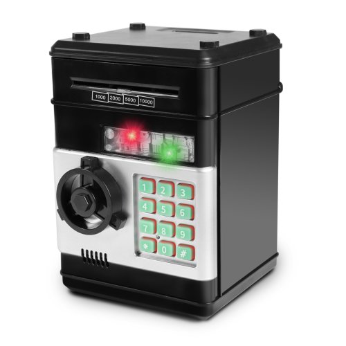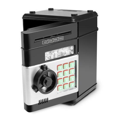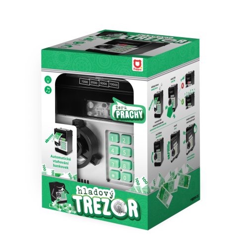 Zábavný elektronický trezor na bankovky a mince. Je velmi dobrým pomocníkem, jak naučit děti šetřit své vlastní peníze a plánovat výdaje. Tato pokladnička na peníze je modernější variantou tradičního prasátka. V případě potřeby lze peníze po zadání správného čtyřmístného PIN kódu ze sejfu odebrat. Otočením kolečka sejf otevřete. Po nastavení je možné zvolit si vlastní heslo. Pokud bude trezor dlouho otevřený, spustí se alarm. Aby byla kasička pro dítě ještě atraktivnější, byla obohacena o zajímavé světelné a zvukové efekty. Do výrobku je nutné vložit 3 ks baterií typu AA, baterie nejsou součástí balení.