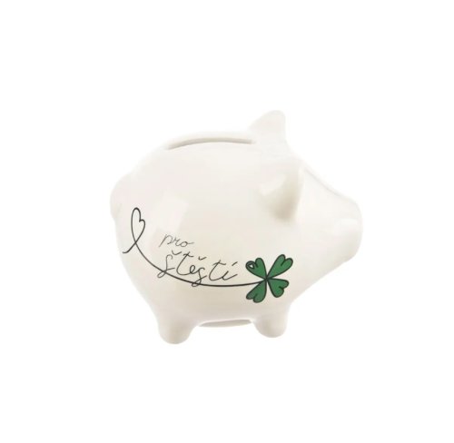 Keramická pokladnička ve tvaru prasátka. Dekor Pro štěstí. Otvor s plastovou zátkou pro vyprázdnění pokladničky zespod. Rozměry 10 x 8.5 x 9 cm. EAN 8592381212001