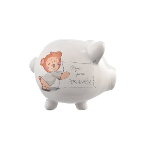 Keramická pokladnička ve tvaru prasátka. Dekor Moje první pokladnička. Otvor s plastovou zátkou pro vyprázdnění pokladničky zespod. Rozměry 10 x 8.5 x 9 cm. EAN 8592381211974