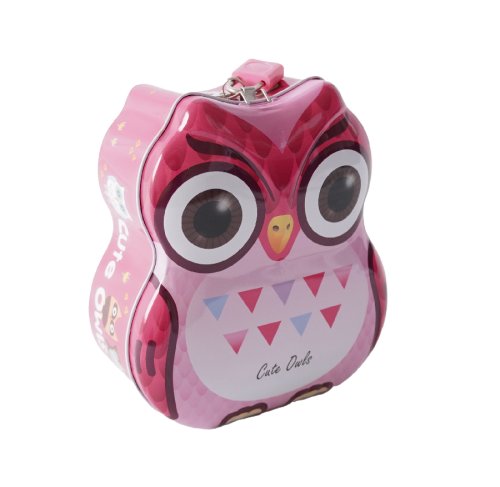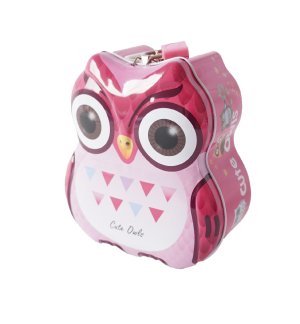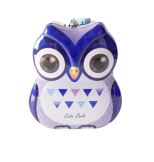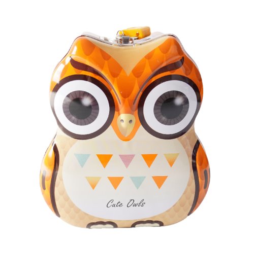 Malá kovová pokladnička se zámkem ve tvaru sovy. Děti učí si střádat své úspory.