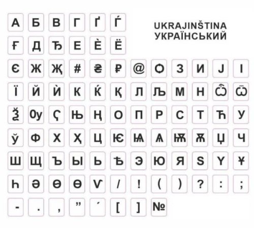 *Bílá barva písma a průhledné pozadí přelepů *Přelepka vhodná na nalepení na tmavou klávesnici s bílým písmem *Azbuka s kompletní sadou znaků používanou na Ukrajině *Jednotlivé přelepky velikost 6 x 7 mm *Kompletní aršík má velikost 10 x 9 cm *Přelepky je možné lepit i na kraj kláves *Kompletní přetisky, vhodné i pro notebooky