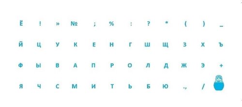 Průhledná samolepka s modrými znaky pro nalepení Azbuky na klávesnici.