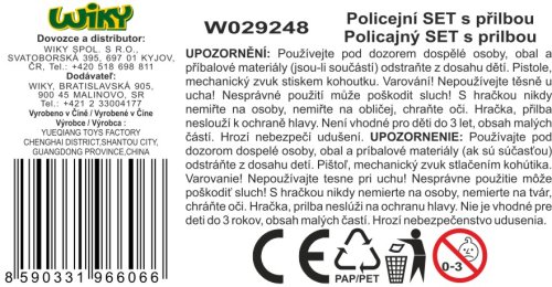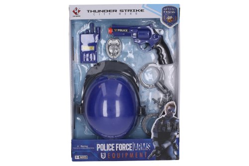 Policejní sada s přilbou 26 x 22 cm. Obsah balení - pistole 20 cm (akustické zvukové efekty), policejní odznak, vysílačka, pouta s klíčem, přilba 26x22 cm.