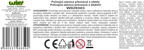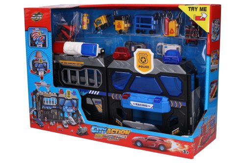 Policejní stanice přenosná. Rozměry 56x18x23 cm. Světelné a zvukové efekty. Aktivace tlačítkem na modrém panelu. 3xAG13 baterie součástí. Součástí 2 auta s volnými koly, mnoho příslušenství (dopravní značky, hasičský přístroj, myčka, čerpací stanice, diagnostika a další).